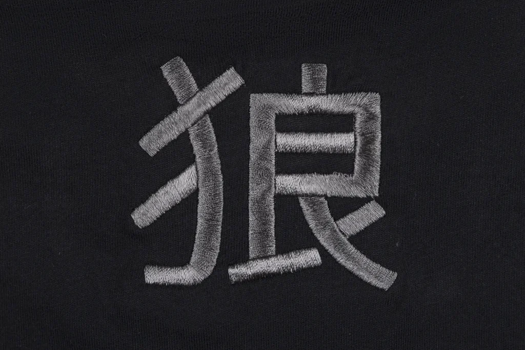 • Japanisches Kanji für „Okami“ als edle Stickerei unter dem Nacken, mit einem schützenden Stoffeinsatz, der sich im Laufe der Zeit sanft auswäscht.
